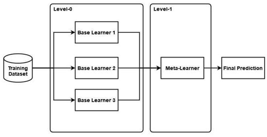Wolpert [65] introduced the stacking ensemble method to improve the predictive performance by combining the outputs of multiple base learners through a meta-learning strategy. The strategy combines several base learners (level-0), which results in several models, and uses a meta-learner (level-1) to retrieve the final prediction. Figure 3 illustrates the stacking ensemble method.