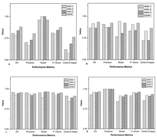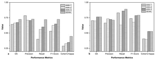 The performance metrics-based evaluation of burned area classifications in the Rokan Hilir Regency using ANN-1, ANN-2, ANN-3, and SENN methods on C-band SAR data is displayed in Figure 4a. Using the SENN method, the highest OA, precision, F1-score, and Cohen’s Kappa were 0.88, 0.80, 0.87, and 0.76, respectively. Meanwhile, the ANN-2 and ANN-3 methods had the same recall value of 1.00. Increasing the OA ranged from 4.24% to 10.17%. With Cohen’s Kappa score, according to Landis and Koch’s categorization [77], all tested methods indicated a substantial agreement. The ANN-2 performed the worst in terms of the OA, precision, F1-score, and Cohen’s Kappa.