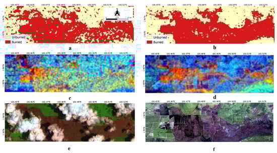 Burned area detection in Rokan Hilir Regency using the SENN method for (a) Sentinel-1 and (b) ALOS-2/PALSAR-2, with visual references: (c) Sentinel-1 (R = VHpre-fire event − VHpost-fire event, G = VVpre-fire event, B = VHpost-fire event) and (d) ALOS-2/PALSAR-2 (R = HVpre-fire event − HVpost-fire event, G = HHpre-fire event, B = HVpost-fire event); (e) Sentinel-2 post-fire RGB composite (B12-B8A-B4); and (f) PlanetScope post-fire composite (B3-B2-B1).