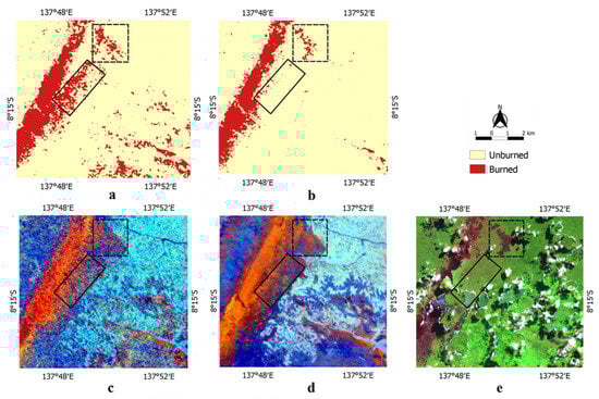 Burned area detection in Merauke Regency using the SENN method for (a) Sentinel-1 and (b) ALOS-2/PALSAR-2, with visual references: (c) Sentinel-1 (R = VHpre-fire event − VHpost-fire event, G = VVpre-fire event, B = VHpost-fire event), (d) ALOS-2/PALSAR-2 (R = HVpre-fire event − HVpost-fire event, G = HHpre-fire event, B = HVpost-fire event), and (e) Sentinel-2 post-fire RGB composite (B12-B8A-B4). Two boxes highlight areas where Sentinel-1 (C-band) detects more BA than ALOS-2 (L-band), indicating overestimation (solid line) and lower detail or more fragmentation (dashed line).
