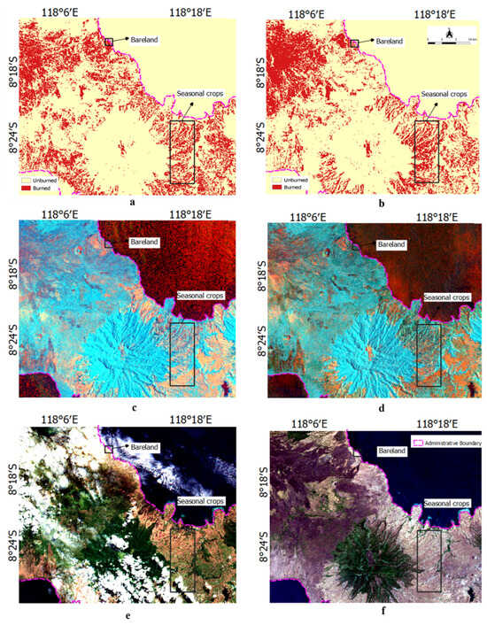 Burned area detection in Bima and Dompu Regencies using the SENN method for (a) Sentinel-1 and (b) ALOS-2/PALSAR-2, with visual references: (c) Sentinel-1 (R = VHpre-fire event − VHpost-fire event, G = VVpre-fire event, B = VHpost-fire event), (d) ALOS-2/PALSAR-2 (R = HVpre-fire event − HVpost-fire event, G = HHpre-fire event, B = HVpost-fire event), and (e) Sentinel-2 pre-fire RGB composite (B4-B3-B2); (f) Sentinel-2 post-fire RGB composite (B4-B3-B2).