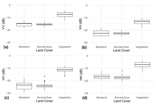 Boxplot comparison of SAR backscatter values (in dB) for different land cover types—bare land, burned area, and vegetation—based on post-fire imagery. (a) Sentinel-1 VV polarization, (b) Sentinel-1 VH polarization, (c) ALOS-2/PALSAR-2 HV polarization, and (d) ALOS-2/PALSAR-2 HH polarization.