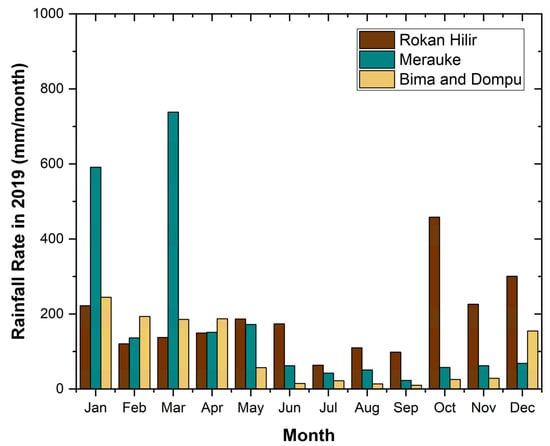 In addition, the Integrated Multi-satellite Retrievals for the Global Precipitation Measurement (IMERG) [59] is a global surface precipitation rate estimator with a spatial resolution of 0.1° or 10 km and a temporal resolution of 30 min. The data were retrieved through NASA Giovanni “https://giovanni.gsfc.nasa.gov (accessed on 24 July 2024)”. This research used the product from January until December 2019 to obtain monthly rainfall rates in every AOI; this allows us to determine soil moisture conditions in each AOI. We used it for further analysis in the discussion section.