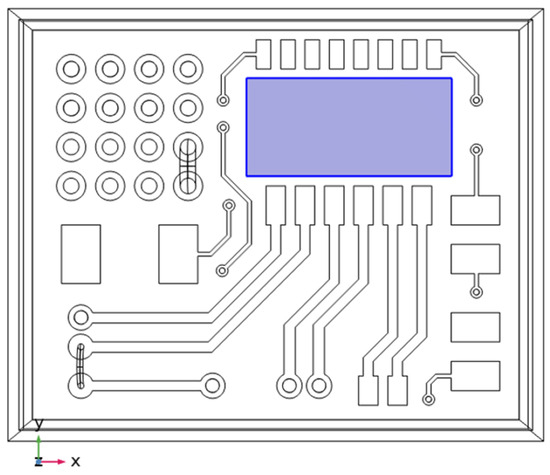 A COMSOL Multiphysics® model was developed to simulate the thermal behaviour of the electronic board within the biomedical device. This model incorporates various parameters, including material properties, component layout, heat generation profiles, and environmental boundary conditions. The governing heat transfer equations are solved using the FEM, yielding spatial and temporal distributions of temperature across the electronic board. To this end, the Heat Transfer Module was coupled with the Structural Mechanics Module, enabling the analysis of thermal conduction and its structural consequences, such as thermal expansion and stress at material interfaces. This coupling is particularly relevant when the temperature field T (V, t) acts as a thermal load on electronic interfaces, which may lead to thermal deformation or fatigue. In the simulation workflow, a steady-state condition was initially assumed to establish baseline thermal behaviour. The electronic board was first designed in the 2D CAD environment of COMSOL and then extruded to generate the final 3D geometry, as shown in Figure 1.