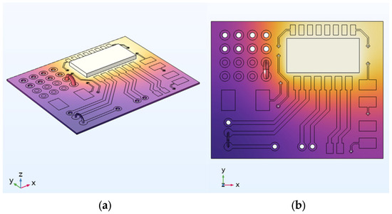 where Tq represents the ambient or externally imposed temperature to which the circuit board is subjected during each simulation. Although these simulations were performed under steady-state conditions, they provide a reliable approximation of thermal stress distribution and highlight areas of potential overheating. Following the stationary study, a transient analysis was conducted on both the entire circuit board and its individual components [75]. In the steady-state regime, temperature evolution is time-independent, and thermal equilibrium implies that the rate of heat influx equals the rate of heat dissipation. However, under transient conditions, thermal accumulation can occur, particularly when the initial heat input exceeds the heat dissipation rate. This results in localised temperature rises and evolving thermal gradients across the device. The transient simulations, performed in COMSOL Multiphysics®, revealed dynamic temperature profiles and the development of thermal stress within specific regions of the board [76,77].