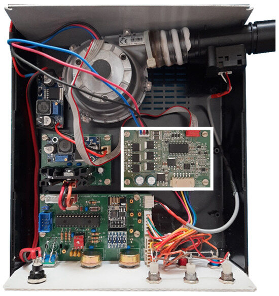 The measurement campaign was carried out on a medical device designed for Non-Invasive Ventilation (NIV) [4,82]. As shown in Figure 3, the internal components include the power supply PCB (centrally located), a brushless fan connected via a rubber tube, and an output nozzle for connecting the respiratory mask.