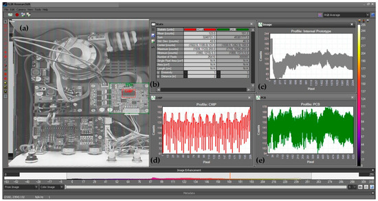 Thermographic analysis of an electronic component using FLIR ResearchIR® software: (a) Internal IR Prototype; (b) Precise thermal statistics; (c) Thermographic trend Prototype image; (d) Thermographic trend CHIP; (e) Thermographic trend PCB.