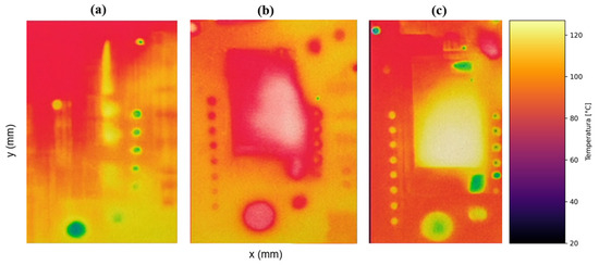 Thermal imaging was performed using a FLIR P660 infrared camera (resolution: 640 × 480 pixels) (Teledyne FLIR, Limbiate, Italy), ensuring high spatial detail and accurate radiometric readings [83]. To enable an accurate comparison between FEM simulation results and thermographic measurements, spatial alignment was performed through a landmark-based affine registration method. In this process, distinctive features such as the corners of the PCB and the edges of the connectors were extracted from both data sources to compute the transformation matrix. This procedure led to a registration error of less than 1.5 percent, calculated as the average pixel displacement, thereby ensuring a reliable overlay and precise pixel-wise correspondence between thermal maps. The entire diagnostic pipeline, which includes both segmentation and classification stages, was able to process each thermal frame in approximately 52 milliseconds, corresponding to a throughput of nearly 19 frames per second. These results confirm the feasibility of real-time operation on systems equipped with a GPU. Further optimisation using TensorRT, manufactured by NVIDIA Corporation, based in Santa Clara, CA, USA, is currently in progress to support deployment on edge computing platforms such as the Jetson Xavier NX. Image analysis was conducted using Teledyne FLIR ResearchIR® software vX.XX, Wilsonville, OR, USA, focusing on the microcontroller board component shown in Figure 4.