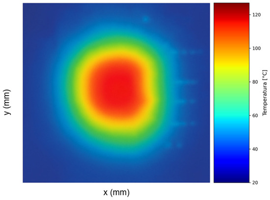 The temperature rise is visualised over time, highlighting the formation of localised thermal gradients due to power dissipation. To provide a more granular understanding of thermal evolution, the circuit board was segmented into distinct subdomains based on material properties. Each region was analysed independently to assess differential thermal behaviour. The numerical results were subsequently validated through a comparison with experimental data obtained via infrared (IR) thermography. The validation process included both passive thermographic imaging (for stationary cases) and active IR thermography (for transient analysis), confirming the consistency and reliability of the proposed simulation framework.