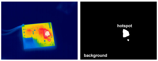The first stage of the proposed model focuses on the automatic identification of thermally anomalous regions using a supervised image segmentation model. Given an infrared thermographic image acquired under controlled active heating conditions (Section 4), we seek to produce a pixel-wise binary mask classification highlighting the areas of highest temperature concentration. Figure 7 describes the process of binary mask segmentation on IR images of biomedical PCBs. U-Net architecture was adopted for this task [91].