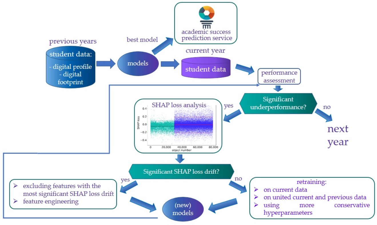 - We proposed a methodology for the comprehensive analysis of learning performance prediction models under data drift, incorporating the following techniques: calculating PSI, training and analyzing Classifier-Based Drift Detector models, and testing hypotheses about SHAP loss value shifts. This allows the evaluation of concept drift, covariate drift, and label drift, as well as the overall model degradation.