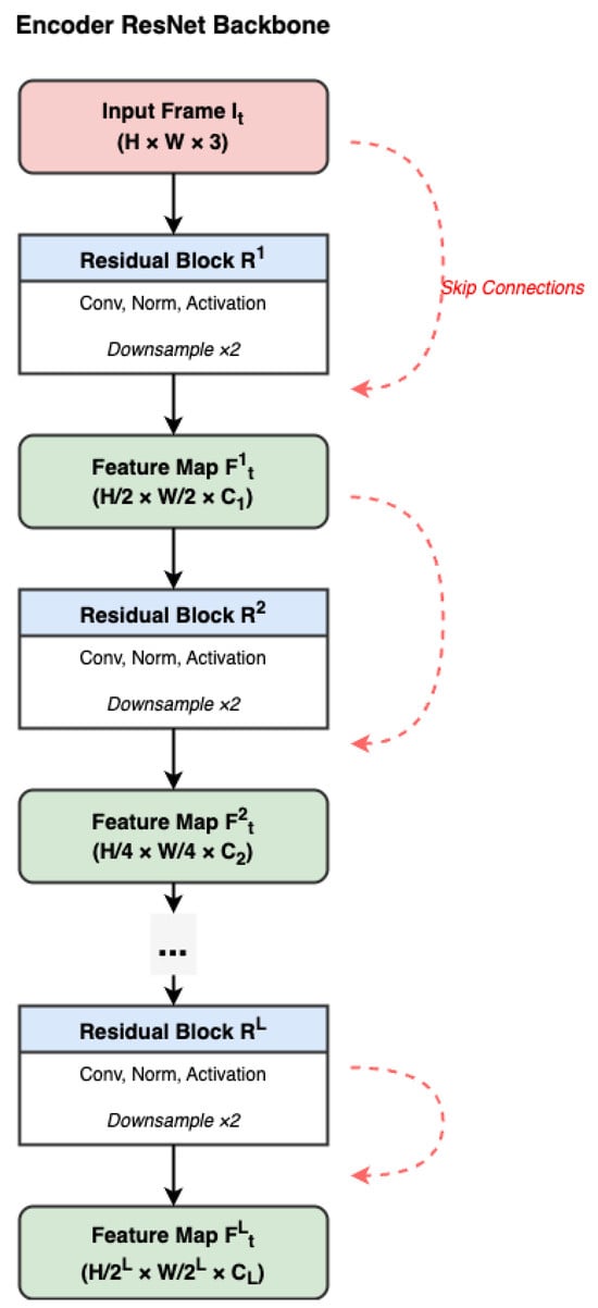 - Frame Encoder (e): The frame encoder serves as the foundation of our architecture, transforming input video frames into meaningful feature representations. Formally defined as ec: R (H×W×Cin) → R(DM), the encoder converts an input video frame Fωt (with height H, width W, and Cin input channels) into a DM-dimensional embedding vector Mωt.Architecture Design: The frame encoder utilizes a ResNet-50 backbone pre-trained on ImageNet, modified with additional convolutional layers for domain-specific feature extraction. The architecture incorporates multi-resolution feature fusion as shown in Figure 2, enabling the capture of both local ball details and global table context. The encoder processes frames independently, generating a sequence of embeddings M = {Mω1, …, MωT} that serve as input to the temporal modeling component.Feature Extraction Strategy: The encoder implements a hierarchical feature extraction approach, combining low-level visual features (edges, colors, textures) essential for ball detection with high-level semantic features necessary for understanding game context. Batch normalization and dropout layers are incorporated to improve training stability and generalization performance.