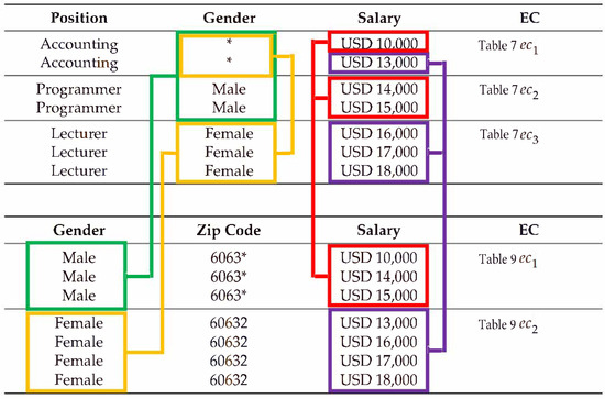 Based on Section 2.1.1 and Section 2.1.2, it is clear that the number of and S attributes influences the data utility of . For this reason, only the utilized and S attributes of D should be available in in D. For example, let Table 4 be the raw dataset D. Suppose that if the data holder only needs to show a statistical report of employee salaries based on gender and position, only , , and are available in the released version of the data in Table 4. Although this privacy preservation solution addresses the data utility issues of , it often leads to privacy violation from data comparison attacks when the adversary has background knowledge about the target user and has received enough released versions of the data in D.