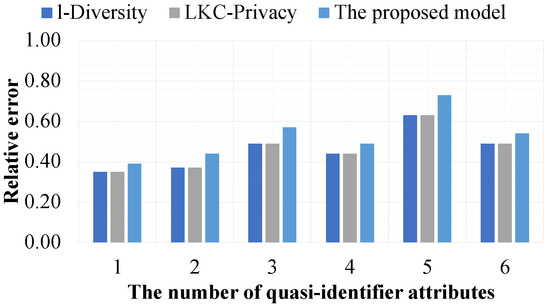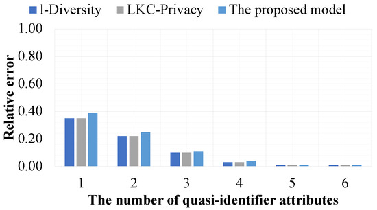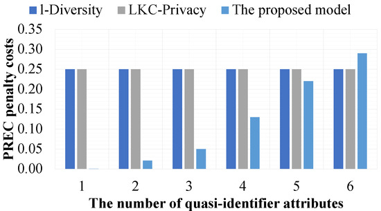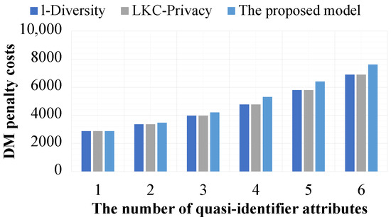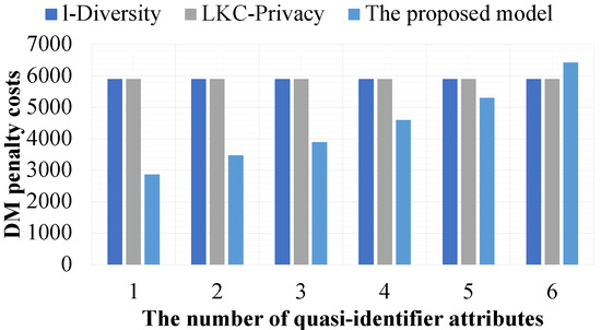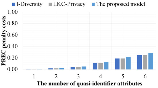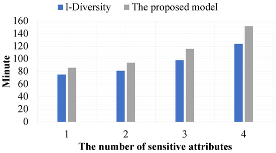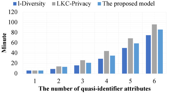 In the seventh experiment, we evaluate the efficiency of the proposed model, which is based on the number of quasi-identifier attributes. In this experiment, the value of l is fixed at 2 for the proposed model and l-Diversity. With -Privacy, the values of L, K, and C are set to the number of quasi-identifier attributes, l, and , respectively. Furthermore, all sensitive values available in the experimental datasets are set as protected sensitive values. Only - is a sensitive attribute, and the number of quasi-identifier attributes varies from 1 to 6.