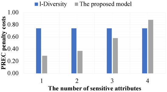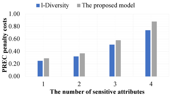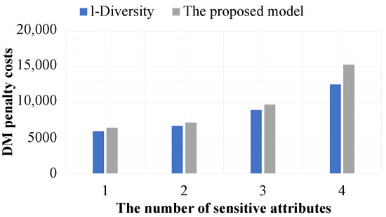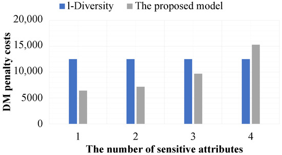 In the fifth experiment, we evaluate the effect of a limited number of sensitive attributes on the data utility of datasets constructed by the proposed model and the compared models such that they are based on and . In this experiment, the proposed model is only evaluated by comparison with l-Diversity because -Privacy cannot address privacy violation issues in datasets that have multiple sensitive attributes, and we assume that the data holder needs to limit the number of sensitive attributes for data release from one to four attributes. For this experiment, the value of l is fixed at 2. All quasi-identifiers and sensitive attributes are available in the experimental datasets.