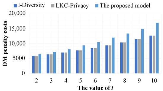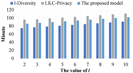 Figure 18, Figure 19 and Figure 20 show that the proposed model is less efficient than l-Diversity, but it is more efficient than -Privacy. The reason l-Diversity is more efficient than all other experimental models is that its privacy preservation constraints are simpler than those of the other models. That is, with the proposed model, in addition to the datasets needing to satisfy the privacy preservation constraints, the compared results must also satisfy the model’s privacy preservation constraints. Thus, in addition to the cost of considering the data from datasets to satisfy privacy preservation constraints, the model incurs the cost of data comparison between it and its corresponding datasets. The reason -Privacy is less efficient than the other experimental models is that it must consider sub-datasets with a size of L at most.