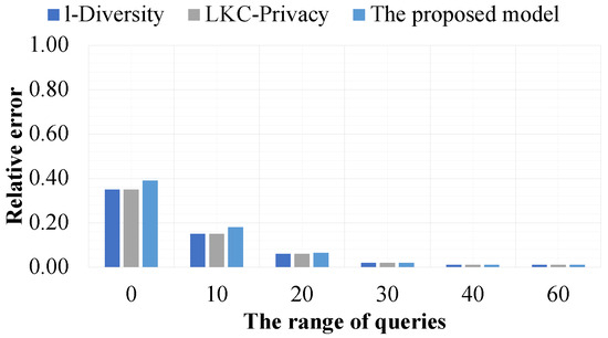 In the sixth experiment, we evaluate the data utility of datasets that satisfy the privacy preservation constraint of the proposed model, l-Diversity, and -Privacy such that they are based on the query function in conjunction with the or query operator and the range of queries and they are evaluated by the relative error metric presented in Section 3.2.3. In this experiment, the value of l is fixed at 2 for the proposed model and l-Diversity. With -Privacy, the values of L, K, and C are set to the number of quasi-identifier attributes, l, and , respectively. Furthermore, all sensitive values available in the experiment datasets are protected sensitive values. Only - is a sensitive attribute, and all quasi-identifier attributes are available in the experimental datasets. Moreover, all of the experimental results are shown in Figure 15 and Figure 16 and are presented as the mean of the average of the results of 15 randomized queries in the form of Query 1. The experimental results are shown in Figure 17 and are presented as the mean of the average results of 15 randomized queries in the form of Query 2.