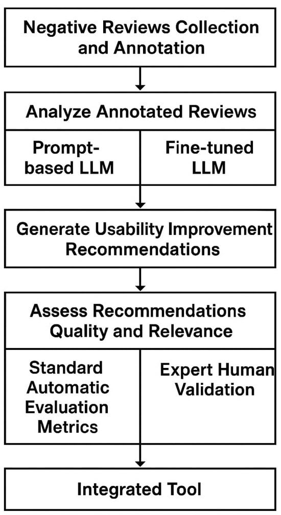 This study aims to evaluate the usability metrics of LLMs in generating actionable usability recommendations from negative app reviews. The proposed methodology consists of five key stages. First, negative user reviews are collected and annotated based on usability issues related to three core factors: correctness, completeness, and satisfaction. Second, the annotated reviews are analyzed to identify the causes of usability issues using both prompt-based and fine-tuned LLM approaches. Third, the system generates usability improvement recommendations to assist developers in addressing the identified issues across the specified factors. Fourth, the quality and relevance of the generated recommendations are assessed using standard automatic evaluation metrics alongside expert human validation. Finally, an integrated tool is developed to streamline the entire process within a unified interface. Figure 1 presents the overall framework of the methodology.