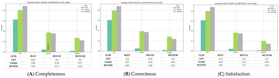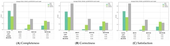 The results are displayed in Table 5 and further visualized in Figure 7A–C, which highlight model-specific performance across the three usability dimensions—completeness, correctness, and satisfaction—using standard evaluation metrics.
