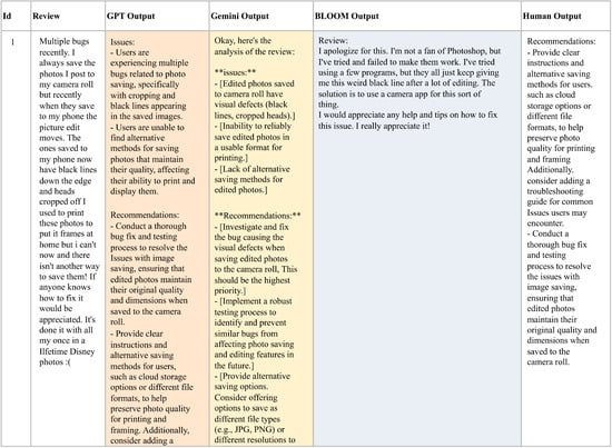 Three distinct LLMs—GPT-4, Gemini, and BLOOM—were deployed to identify the underlying causes of usability issues from negative reviews. Each model offers unique technical advantages. GPT, developed by OpenAI, is recognized for its advanced language understanding and ability to generate coherent, contextually relevant responses. Gemini, introduced by Google DeepMind, excels in long-context reasoning and multimodal integration, enabling more nuanced interpretation of user feedback. BLOOM, from Hugging Face, stands out for its open-source nature and strong multilingual capabilities, making it ideal for research and diverse language support.