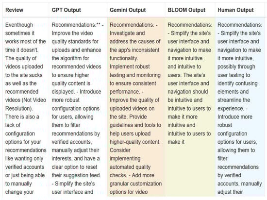 Figure 8 presents sample recommendations generated by the three fine-tuned LLMs (GPT, Gemini, and BLOOM) in response to a given negative user review, alongside the corresponding recommendation provided by a human expert to enhance usability.