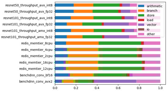 The percentages of different instruction categories on each workload can be seen in Figure 2. This image visually represents how these instructions are used in the context of each workload. This graphical representation provides insights into the interplay between instructions and test cases, thereby aiding in a more comprehensive understanding of the computation dynamics in the platform under test.