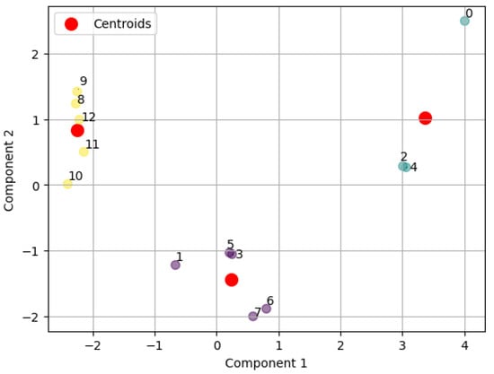 Following the application of PCA to reduce the dataset to two components, the next step involves applying unsupervised ML algorithms for clustering. However, before proceeding, it was necessary to determine the optimal number of clusters. One widely used technique in unsupervised ML clustering is the elbow method. This method suggests that the optimal number of clusters can be determined by identifying the point at which increasing the number of clusters does not substantially reduce the SSE. According to the data in Figure 3, the elbow point suggests that the optimal number of clusters is three. Figure 3 illustrates the relationship between the number of clusters and the SSE. As the number of clusters increases, the SSE decreases, but the rate of improvement diminishes after three clusters. This elbow in the curve indicates the point where adding more clusters yields minimal additional benefit, supporting the selection of three clusters as the most efficient balance between model complexity and explanatory power.