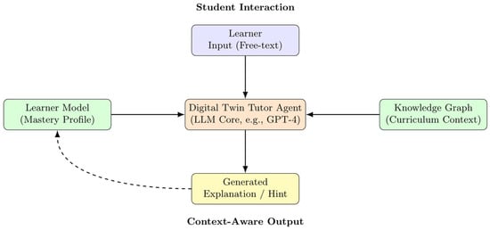 Transformer-based language models have rapidly become central to next-generation adaptive learning innovations [3,4]. LLMs can now spontaneously generate contextualized explanations, examples, and questions. Examples include GPT-4 and other models that allow real-time interactivity and dialog in the voice of a human tutor [2]. Such systems can now be envisioned as digital twin tutors, AI-driven software agents that reproduce the instructional behavior, responsiveness, and adaptation of human educators in real time. Here is the new paradigm: Generative intelligent tutoring systems that utilize LLMs to spontaneously generate personalized interactions and content. A high-level schematic of such a transformer-based digital twin tutoring system is depicted in Figure 2, showing the integration of learner input, domain knowledge, and student modeling within a core language model architecture.