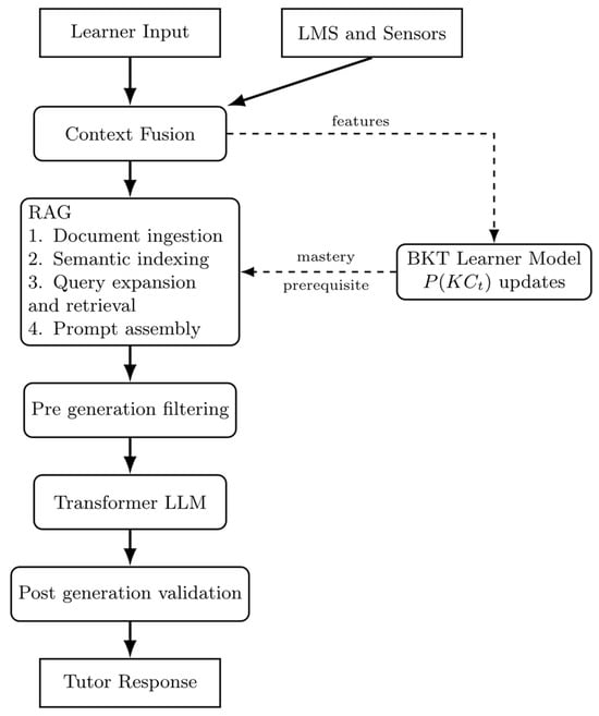 - Dialogic layers (generative reasoning and interaction orchestration) regulate the tutor’s communication behavior. RAG facilitates pedagogically bounded content construction, while policies of orchestration decide the timing and form of the prompts, hints, and reflective turns [17,18].