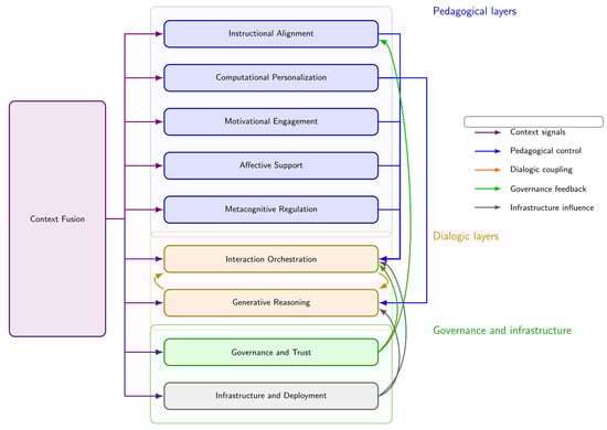 The system is structured around a context fusion layer that provides situated intelligence to each phase of the agent loop. Sensor signals, activity traces, and learning management system data are combined and normalized into a multimodal representation robust to noise and missing data. The top levels represent pedagogical intention and decide what to adapt for the student. The middle levels implement reasoning and dialog faithfully to pedagogy. The bottom levels ensure trust, privacy, compliance, and performance. This division of concerns adheres to microservice style but stays rooted in learning science, such as socio-cognitive scaffolding, self-regulated learning, and dialogic instruction.