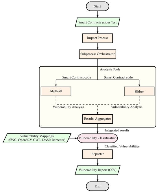 This section introduces the LightCross tool. Figure 1 provides an overview of the five main modules and the workflow of the tool. The workflow begins with smart contracts under test being processed through an import procedure, which feeds them into a subprocess orchestrator. This orchestrator distributes the smart contract code to multiple back-end detector tools, specifically Mythril and Slither, which perform a parallel vulnerability scan using different detection techniques. The detection results are then sent to the results aggregator that consolidates the findings. The consolidated results are subjected to vulnerability classification, which leverages standardised vulnerability mappings (including SWC, OpenSCV, CWE, DASP, and Rameder taxonomies) to categorise detected issues according to established security frameworks. Finally, a reporter component transforms these classified vulnerabilities into a structured CSV report, providing an overview of security issues identified in smart contracts. This architecture enables efficient multi-tool analysis while standardising vulnerability reporting across different detection engines.