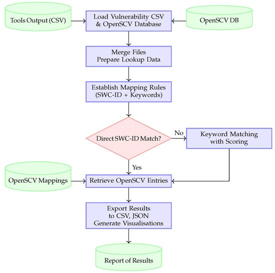 Classifying vulnerabilities starts with SWC IDs for Mythril and heuristically assigning the output detectors to SWC IDs. Initially, we import the baseline data for the SmartBugs curated dataset [16] to assess whether the detectors have accurately identified the vulnerabilities. The next step is to map the SWC ID to the DASP categories. Although the DASP classification is coarse, vulnerabilities in the baseline data are specified using DASP. We utilise the OpenScvVulnerabilityMapper component to map the vulnerability to the OpenSCV classification. We initialise the OpenSCV dataset that includes a mapping of the OpenSCV classification entries to SWC IDs. An SWC ID can be assigned to one or more OpenSCV classification entries. For example, the SWC ID 101 corresponds to multiple vulnerabilities such as integer underflow/overflow, divide by zero, integer division truncation bugs, and signedness bugs. In order to determine the accurate OpenSCV entry corresponding to the vulnerability, we use keyword-based matching analysing the vulnerability descriptions and synonyms that are included in the OpenSCV dataset. In the following, we outline the procedure for mapping the vulnerabilities (Figure 2):