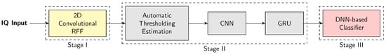 Proposed architecture of CRFFDT-Net. Stage I holds the enhanced signal-representation method based on a convolutional RFF. Stage II includes the threshold-denoising process and time-domain feature-extraction module. Stage III corresponds to the DNN-based classifier.