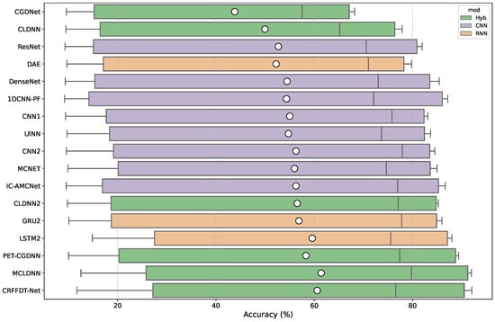 Boxplots showing modulation classification accuracy across state-of-the-art approaches and the proposed CRFFDT-Net, with circles denoting mean values.