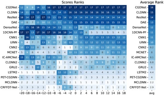 A detailed analysis of the classification results is presented in Figure 3, which shows the ranking of each model across different SNR levels (left matrix) and the corresponding average ranking (right vector). The matrix displays the rank scores for each model at each SNR level, based on their classification performance. For example, at an SNR of dB, the proposed CRFFDT-Net ranks first, followed by the LSTM2 model in second place, and so forth.