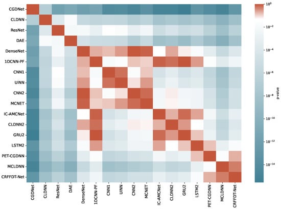 To assess the statistical significance of the similarities and differences among the obtained results, we first applied a Friedman test, considering only the SNR values above 0. The test yielded a p-value of , indicating statistically significant differences among the evaluated models. To further investigate the source of these differences, we conducted pairwise t-tests, and the resulting p-values are summarized in Figure 4. From the pairwise t-test results, we observe no statistically significant differences among the higher-performing CNN-based models. Likewise, no significant differences were found among the RNN-based models, namely GRU2, LSTM2, IC-AMCNet, and CLDNN2. In contrast, our proposed model exhibits statistically significant differences when compared to all other models, except MCLDNN and PET-CGDNN.