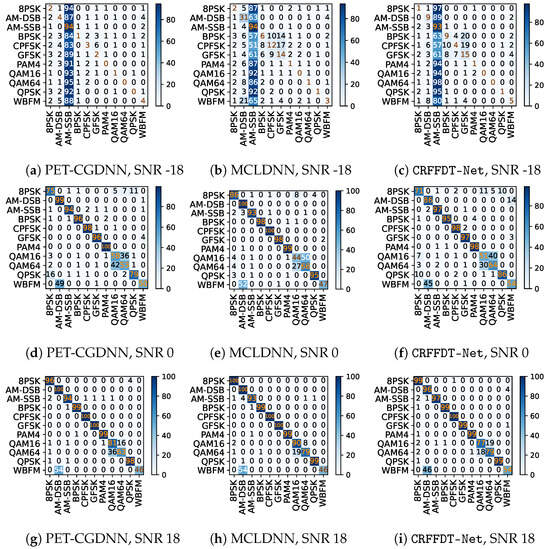 Based on the above findings, we center our subsequent analysis on our proposed model and the two most comparable alternatives (MCLDNN and PET-CGDNN) given their similar performance profiles and the absence of statistically significant differences in the pairwise comparisons. We analyze the results under three distinct noise conditions (high, medium, and low), corresponding to SNR levels of , 0, and 18 dB, respectively. Figure 5 presents the confusion matrices for each considered noise level. In general, PET-CGDNN, MCLDNN, and our proposed model demonstrate comparable performance, exhibiting similar classification patterns across the different SNR scenarios. These observations are consistent with the outcomes of the pairwise t-tests. Under high noise conditions ( dB), all three models tend to classify a majority of signals as AM-SSB, with this tendency being most prominent in PET-CGDNN. Meanwhile, MCLDNN and CRFFDT-Net show a slight inclination to confuse instances of BPSK, CPFSK, and GFSK among each other. Notably, MCLDNN correctly classifies a significant portion of AM-DSB signals but also mislabels several WBFM samples as AM-DSB. Unlike narrowband modulations, WBFM spans a much wider frequency range and includes nonlinear phase and amplitude variations that often overlap spectrally with other modulation schemes when processed under low-SNR conditions [51]. As the SNR increases from 0 dB and 18 dB, a clear improvement in classification accuracy is observed. Nevertheless, misclassification of WBFM signals as AM-DSB persists, albeit with reduced frequency, particularly in the case of our proposed model. At these higher SNR levels, all three models encounter difficulties in distinguishing between QAM16 and QAM64; however, this issue is less severe in MCLDNN and CRFFDT-Net, especially under low noise conditions.