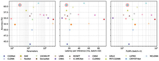 Illustration of the trade-offs between average classification accuracy across all SNR levels (from dB to dB) and three key complexity metrics: the number of trainable parameters, the inference latency measured on a Jetson Nano device (NVIDIA Corporation, Santa Clara, CA, USA), and required FLOPs. The lower average accuracy values reflect the inclusion of challenging low-SNR scenarios. The proposed CRFFDT-Net is highlighted with a red circle.
