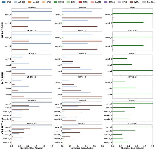 We use the GradCAM++ method across different SNR levels, aiming to identify the regions within each model that contribute most significantly to classification decisions. For each sample and modulation class, we computed CAMs over all eleven classes and across each convolutional layer independently for the in-phase (I) and quadrature (Q) components. The resulting maps were normalized by class and layer, then averaged to obtain representative layer activation profiles. The outcomes of this analysis at an SNR dB are illustrated in Figure 7. In this case, we show the estimated CAM-based layer activation profiles for three modulation classes: CPFSK, which performs of classification accuracy; AM-DSB; and WBFM, which has a high misclassifications level. As a result, we obtain a bar-plot graphic per model and modulation class to analyze which layers are most influential in the classification process.