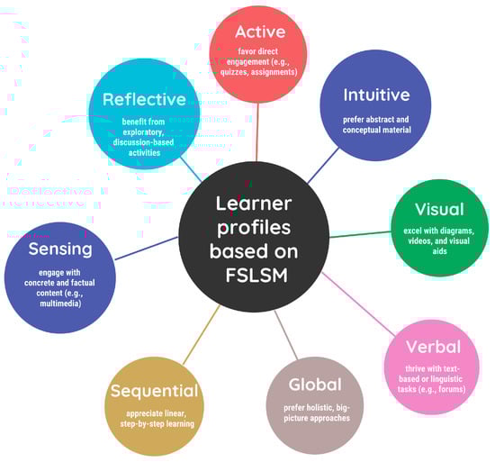 The Felder–Silverman Learning Style Model (FSLSM) is a widely adopted framework for describing individual learning preferences across four cognitive dimensions: processing (active vs. reflective), perception (sensing vs. intuitive), reception (visual vs. verbal), and understanding (sequential vs. reflective) [11,12,13]. It was originally developed for engineering education but has since been applied extensively in personalized learning systems [2,14,15].