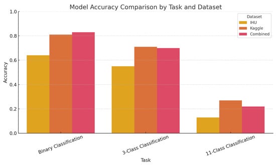 Also, Figure 6 visualizes the results for the Combined dataset. Despite some improvement in binary classification accuracy, performance remained inconsistent in other tasks. This supports the hypothesis that combining datasets without accounting for domain heterogeneity may introduce noise rather than strengthen generalizability.