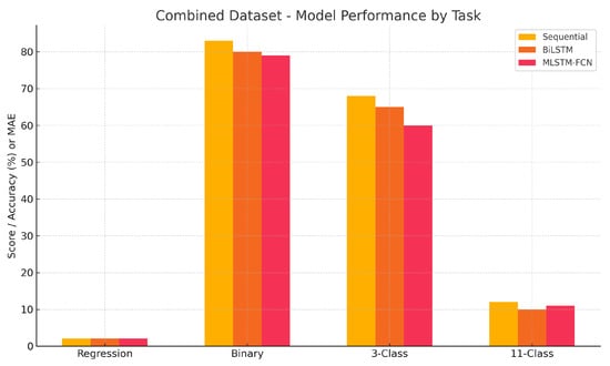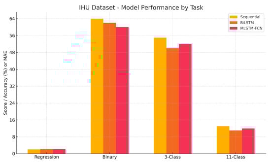 A corresponding visualization for the IHU dataset is shown in Figure 4, which illustrates the limited predictive power of all models, especially in regression and 11-class classification tasks. The figure underscores the comparatively stronger, but still moderate performance of the Sequential model in binary and three-class classification, and the generally weak signal quality present in the IHU log data.