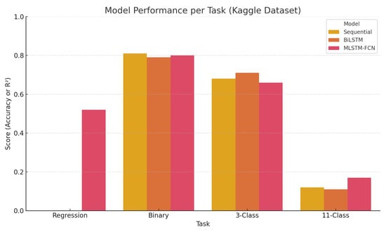 A graphical representation of the Kaggle dataset results is provided in Figure 5, complementing the tabular summary and offering a clearer visual comparison of model effectiveness across tasks. This visualization reinforces the superiority of the Sequential model in classification tasks and illustrates the limited gains of regression and fine-grained prediction, even with richer input data.