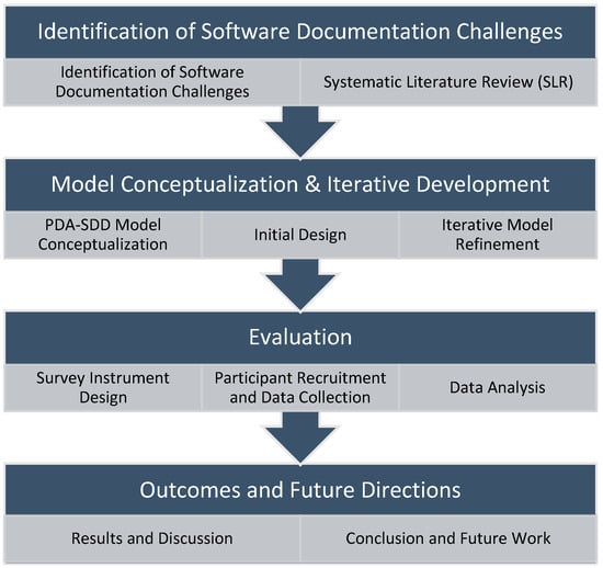 The core rationale behind the conception of the PDA-SDD model stems directly from the persistent research gap explicitly identified in Section 3: the notable absence of a single, integrated framework capable of offering simplicity, generality, and efficiency in comprehensively managing all facets of software documentation across its entire lifecycle. Current documentation practices often rely on a disparate collection of specialized tools, each powerful within its niche but fundamentally lacking a cohesive overarching strategy that supports documentation’s evolution and integration. For instance, while IBM DOORS [47,48] provides robust capabilities for requirements traceability in large, complex, and often highly regulated projects, its primary focus remains on requirements management rather than comprehensive, evolving documentation across all project phases. Similarly, modern platforms like GitBook [49] and Stoplight [51] excel at facilitating collaborative content creation, version control, and automated publishing, particularly for API documentation [50,60] or internal knowledge bases, yet they do not inherently provide the structured guidance for capturing the full spectrum of development rationale, design decisions, and operational details from project inception to post-deployment. Even sophisticated Model-Based Systems Engineering (MBSE) tools [52] integrate design and analysis with documentation by linking artifacts to a central model, but their adoption often requires specialized expertise, significant upfront investment, and a particular development paradigm, thereby limiting their universal applicability and simplicity for all project types and team sizes. These existing solutions, while undoubtedly valuable, tend to operate in silos, demand significant integration overhead, or fail to provide the unified, holistic view of documentation’s evolution needed from initial conceptualization (pre-implementation) through active development (during-implementation) to ongoing post-deployment maintenance. The critical imperative for a model that actively bridges these functional and temporal gaps, enabling documentation to function as a continuous, living artifact rather than a static, burdensome deliverable, served as the primary driving force for the ideation and rigorous development of PDA-SDD.