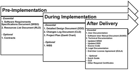 After-implementation, essential documentation includes user documentation (Software User Manual), technical documentation (updated SRSD, DDD, and Source Code), and legal documentation (End User License Agreement). Optional components may include a Quick Guide, updated CLD, and relevant certifications.