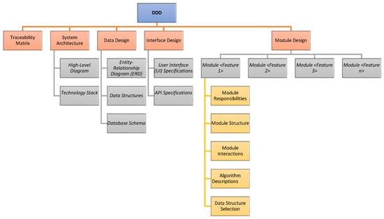 The Detailed Design Document (DDD) constitutes a cornerstone of the proposed model within the During-implementation component of the PDA-SDD Model. As illustrated in Figure 5, the DDD encompasses several sections.