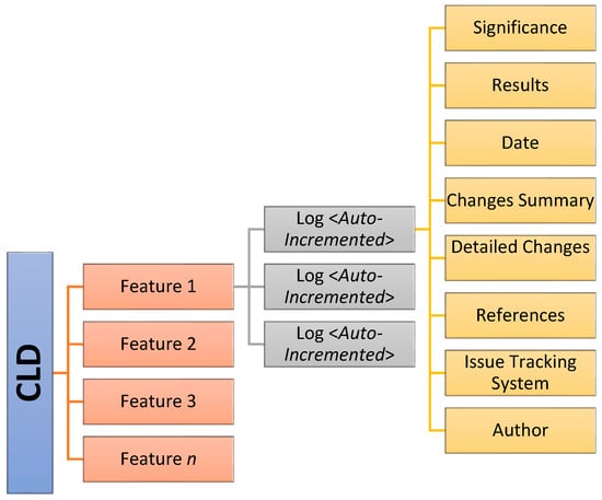 As illustrated in Figure 6, the CLD structure is characterized by a feature-based organization, where each feature corresponds to a main function from the SRSD. Within each feature, a series of Logs, identified by unique incremental numbers, are employed to record specific activities related to the function. Each Log comprises eight essential elements that provide a comprehensive account of the activity.