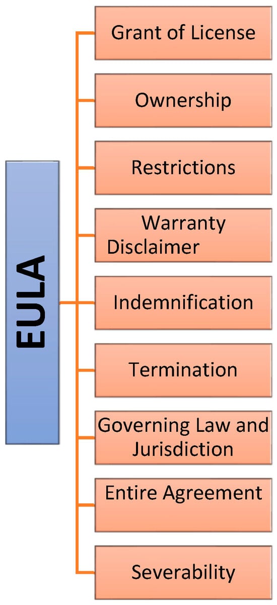 As illustrated in Figure 8, the PDA-SDD model outlines a nine-section EULA framework. These sections include: Grant of License, Ownership, Restrictions, Disclaimer of Warranty, Indemnity, Termination of Agreement, Governing Law and Jurisdiction, Entire Agreement, and Severability. This standardized structure provides a valuable reference point for drafting and understanding EULAs.