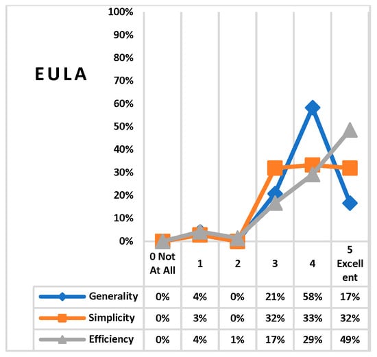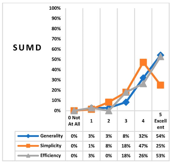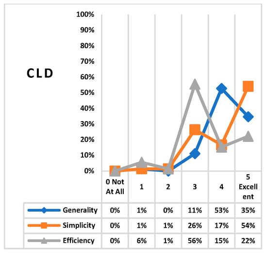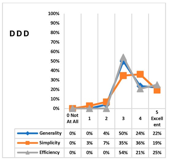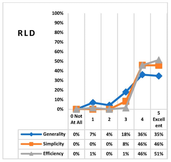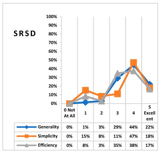 Analyzing the results from the second section of the questionnaire (Figure 9, Figure 10, Figure 11, Figure 12, Figure 13 and Figure 14), the SRSD sub-model elicited predominantly positive responses across all three criteria. Specifically, over 69% of participants assigned high ratings for generality, exceeding 65% for simplicity, and surpassing 55% for efficiency. Turning to the RLD sub-model, the data reveal exceptionally high evaluations, with the efficiency criterion garnering a near-unanimous high rating of approximately 97%, closely followed by simplicity at 92%. In contrast, the DDD sub-model exhibited a greater degree of divergence. Notably, 55% of respondents provided high ratings for simplicity, while only 46% considered its generality and efficiency to warrant high ratings.