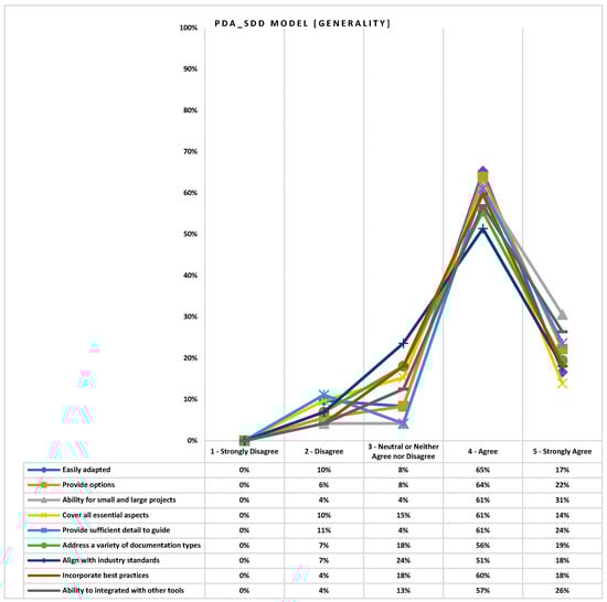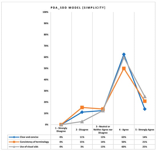 Among the nine statements designed to evaluate generality, a substantial 92% of participants expressed agreement or strong agreement that the model is suitable for implementation across both small- and large-scale software development projects (Figure 15). Furthermore, a significant majority (exceeding 80%) affirmed that the model could be easily adopted and integrated with existing toolchains. Regarding simplicity, a significant majority (76%) agreed that the model exhibits a commendable level of clarity and conciseness (Figure 16). Additionally, an even more substantial proportion of participants (85%) affirmed that the model effectively supports the integration of visual aids, underscoring its perceived pedagogical value.